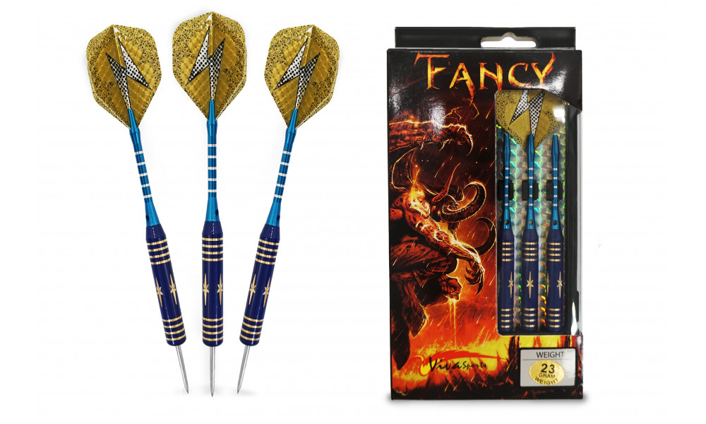 Дротики являются важнейшим элементом для игры в дартс, от их особенностей напрямую зависит уровень и качество игры. Комплект дротиков для игры в дартс среднего уровня из игровой серии FANCY. Комплект состоит из 3 дротиков весом 23 гр, баррель которых изготовлен из латуни. Латунные дротики являются общедоступным инструментом как для любителей, так и для профессионалов. Алюминиевые хвостовики в сочетании с оперением дают жесткую но при этом легкую конструкцию. Стальные иглы легко и устойчиво “входят” в мишень, что обеспечивает более точные и стабильные броски, исключая вероятность отскока. Комплект состоит из 3 баррелей, 3 хвостовиков, 3 оперений и кейса. Разборная конструкция дротиков позволяет заменить его хвостовик и оперение по мере изнашивания оборудования.