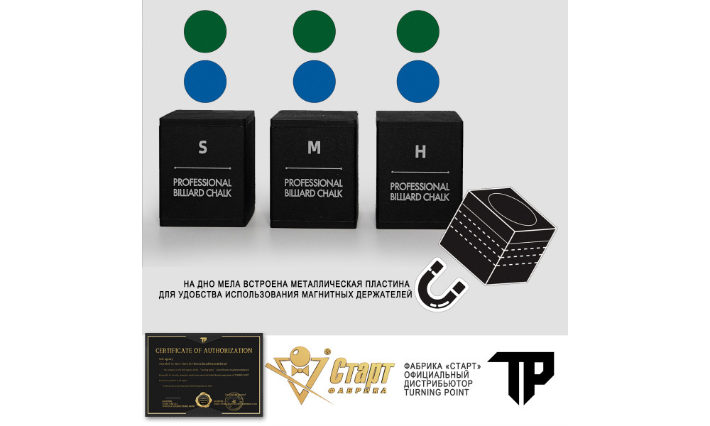 Мел Turning Point Pro H предназначен для жестких наклеек, так как в структуру спрессованной смеси входит ультрадисперсный порошок. Формула абразивных веществ задает мелу нужную твердость, идеально рассчитанную под жесткий тип наклейки. Мел отличают высокие абразивные свойства, он создает лучшее трение и уровень сцепления между жесткой наклейкой и шаром, минимизируя вероятность неудачного удара. В палитре два основных цвета: синий и зеленый, в соответствии с самыми популярными цветами сукна. Следы от мела минимально заметны на сукне. Для удобства использования на дно мела встроена специальная металлическая пластина, поэтому его легко и быстро можно закрепить на магнитном держателе.
